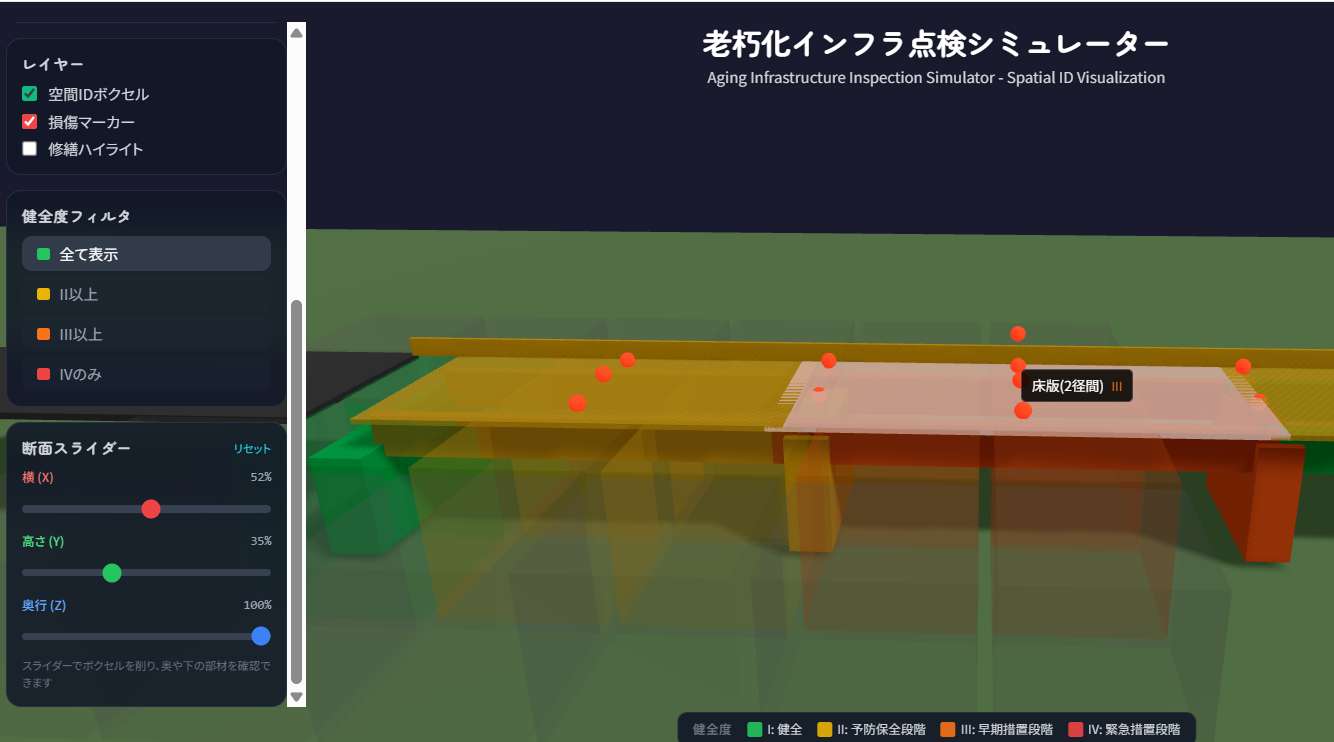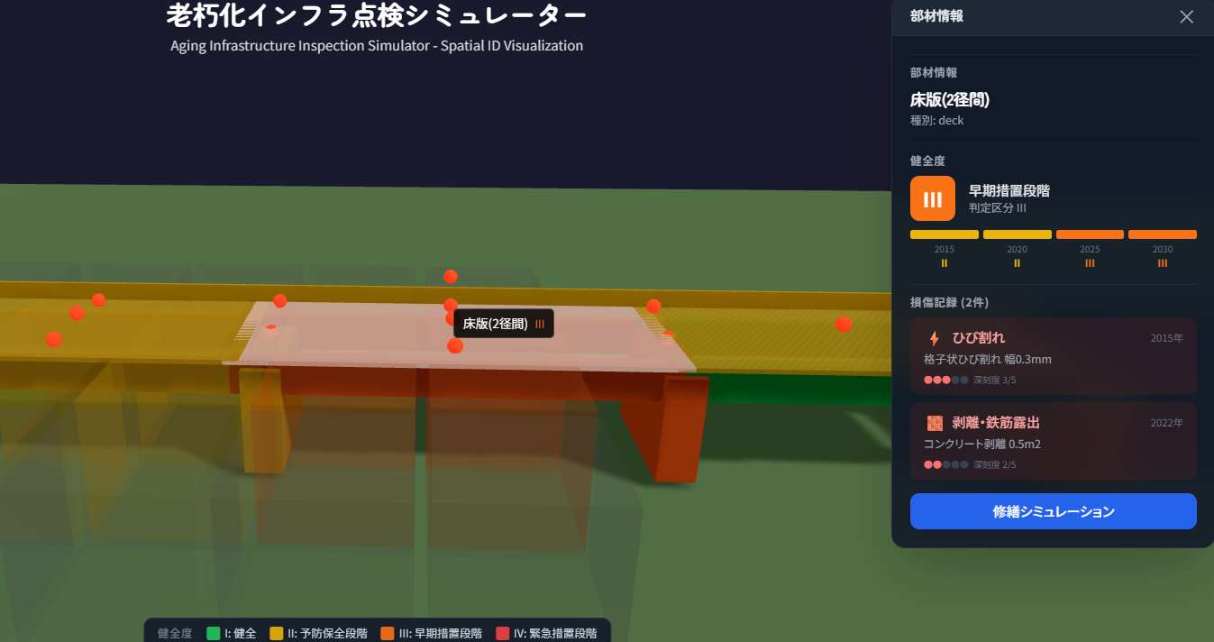 橋梁・トンネルの老朽化を空間IDで3D可視化。部位別の健全度判定、損傷記録、LCCベースの修繕シミュレーションを備えたインフラ点検シミュレーターの技術解説。